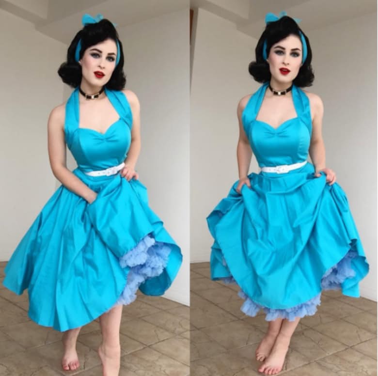 With jet black hair and a perfect hour-glass figure (reminiscent of the one and only Marilyn Monroe), Instagram model KirstieMyDear is a Canadian law student who has nailed a vintage look. Clearly inspired by the 1950s above all else, she seems to be channeling Betty Page and Ava Gardner. In this look she is creating her own interpretation of the classic Cinderella look and we have got to say it looks great on her! If you glance at her Instagram page for one minute you’ll notice that she does some really amazing versions of Disney characters, but also a lot of classic pinup looks.
